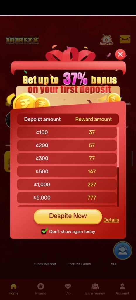 101Betx एक ऐसा gaming platform है जो open करते ही user को सीधे bonus और reward system के साथ connect कर देता है। कई apps में users को पहले explore करना पड़ता है, लेकिन यहाँ शुरुआत में ही “get up to 37% bonus on your first deposit” जैसा offer दिखता है, जिससे user को तुरंत समझ आ जाता है कि यह platform reward-focused