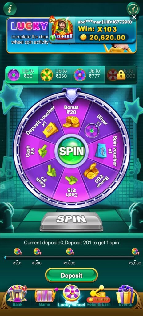 जब कोई user 200 deposit करता है तो उसे Lucky Wheel Spin करने का chance मिल सकता है।