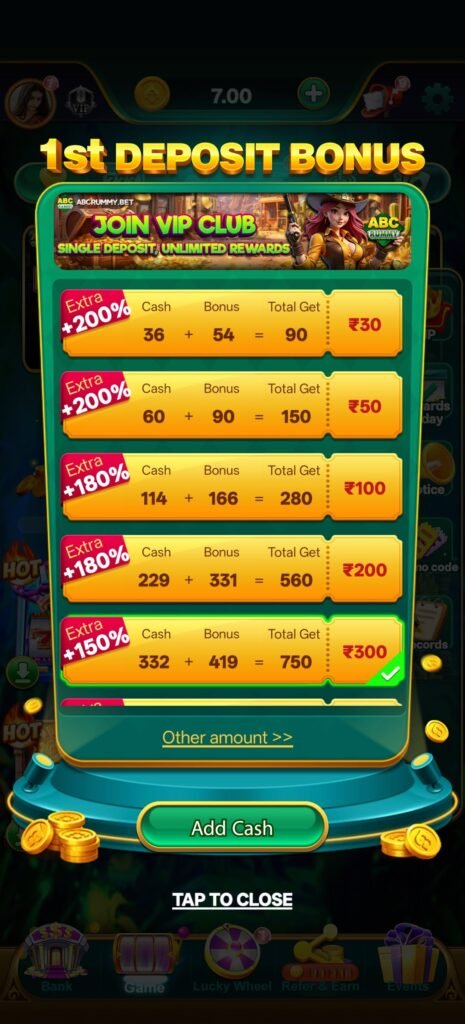 ABC Rummy नए users को शुरुआत में ही 7 से 100 तक welcome bonus देता है।