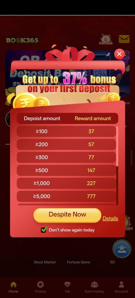 Book365Bet पहली नज़र में ही यह clear कर देता है कि यह कोई normal gaming app नहीं है, बल्कि ऐसा platform है जहाँ entry लेते ही user को सीधे reward system के साथ connect किया जाता है। जैसे ही app open होता है, सामने “get up to 37% bonus on your first deposit” जैसा offer दिखता है, जो साफ signal देता है कि यहाँ gameplay के साथ-साथ earning opportunities भी equally important हैं।
