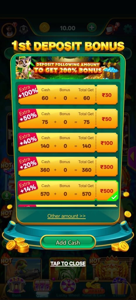 इस app में deposit करने पर extra bonus भी मिलता है, जो amount के हिसाब से अलग-अलग है: