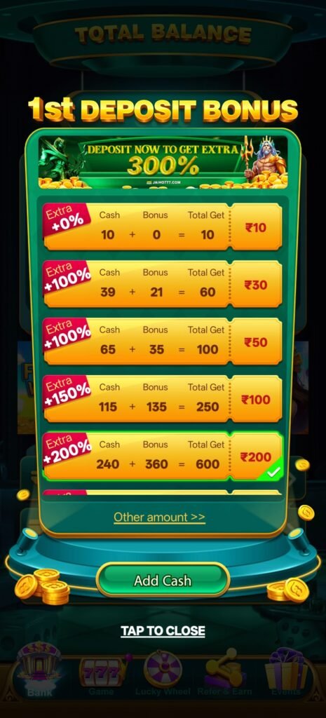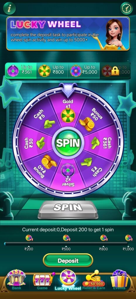 इस app की खास बात इसका deposit bonus system है, जहाँ अलग-अलग amount पर extra bonus मिलने की possibility रहती है। इससे users को अपने gameplay balance को बढ़ाने का मौका मिलता है। इसके साथ ही lucky wheel spin feature, जो specific deposit पर activate होता है, users को random rewards पाने का एक exciting option देता है।