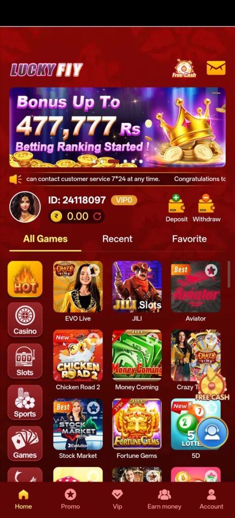 Lucky Fly Bet शुरुआत से ही यह दिखा देता है कि यह platform सिर्फ खेलने के लिए नहीं बना, बल्कि user को entry लेते ही कुछ value महसूस कराने के लिए design किया गया है। जैसे ही app खुलता है, सामने deposit के साथ extra reward मिलने का offer दिखता है—लेकिन फर्क यहाँ wording में नहीं, experience में है।