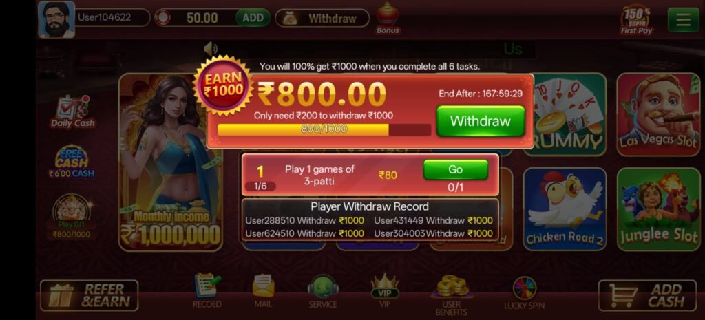 Platform पर “Earn 1000 Cash” option उपलब्ध है जिसमें ₹800 amount पहले से credited दिखाई दे सकता है। Remaining ₹200 unlock करने के लिए 6 tasks complete करने होते हैं जो platform activity पर आधारित होते हैं।
