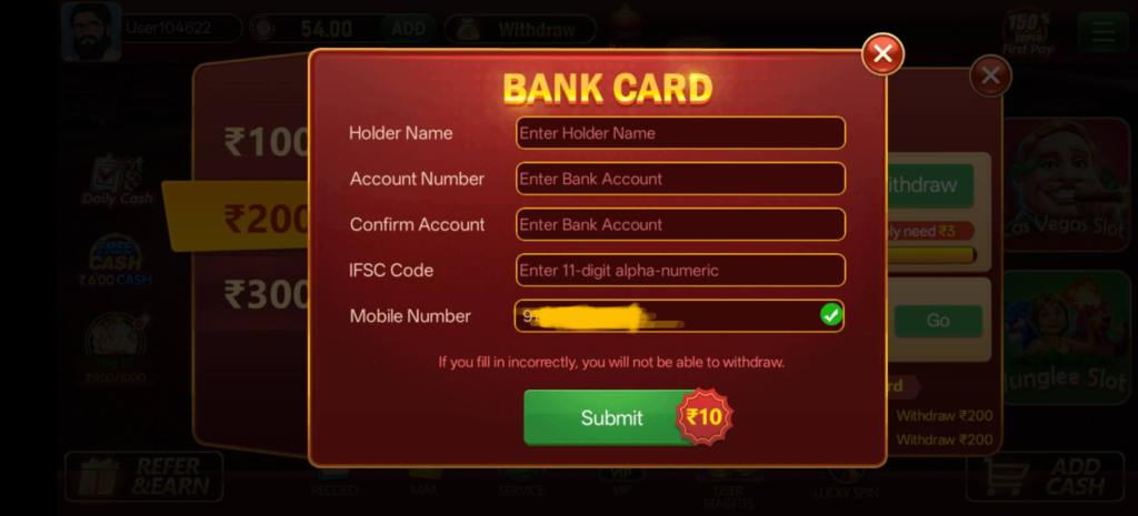 Game में “Earn 200 Cash” feature भी दिया गया है जिसमें ₹197 पहले से credited दिखाई देता है। User को withdrawal information submit करने के बाद ₹10 additional reward प्राप्त होता है।