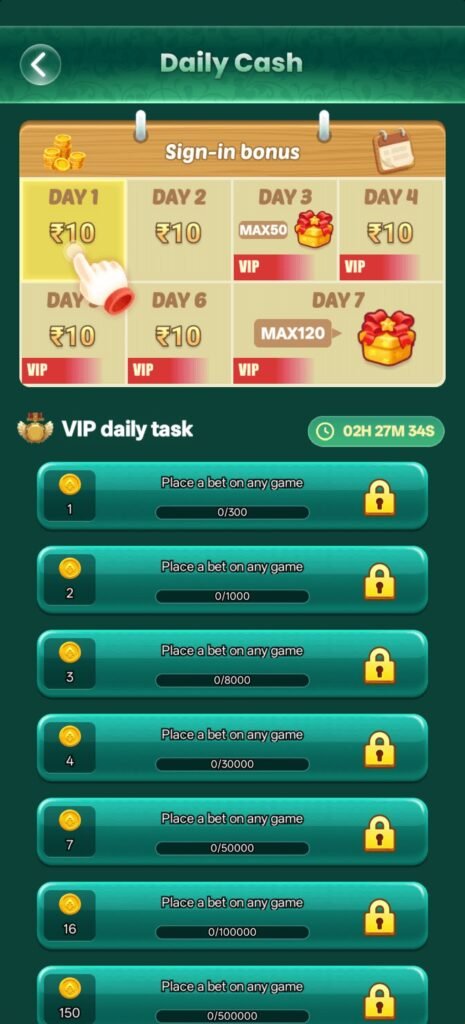 Players को Day 1 से Day 7 तक login करने पर daily rewards मिलने की possibility होती है। इससे users को platform पर regular activity करने के लिए encourage किया जाता है।