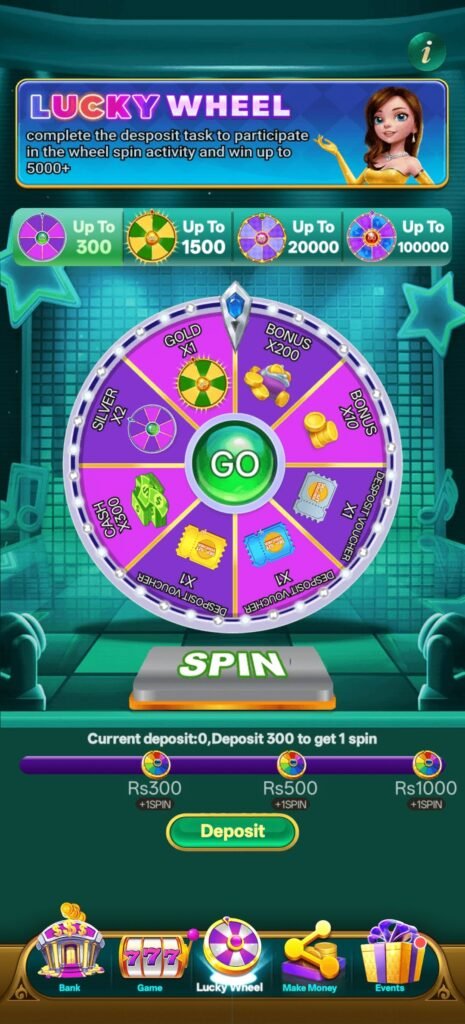 उदाहरण के लिए अगर कोई player 100 deposit करता है तो उसे Lucky Wheel Spin मिलने का chance मिलता है।