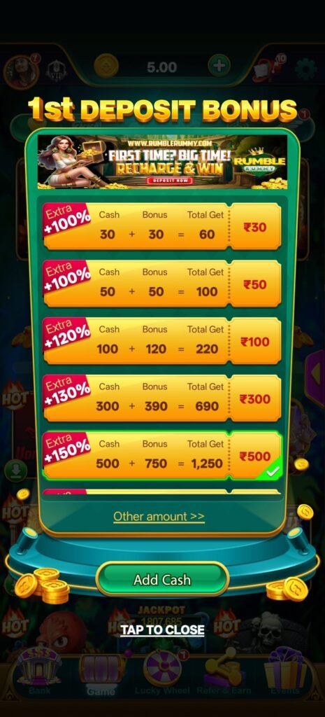 Rumble Rummy में players के लिए First Deposit Bonus System भी दिया गया है।
