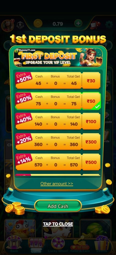 Rummy 77 नए users को शुरुआत से engage करने के लिए welcome bonus system देता है: