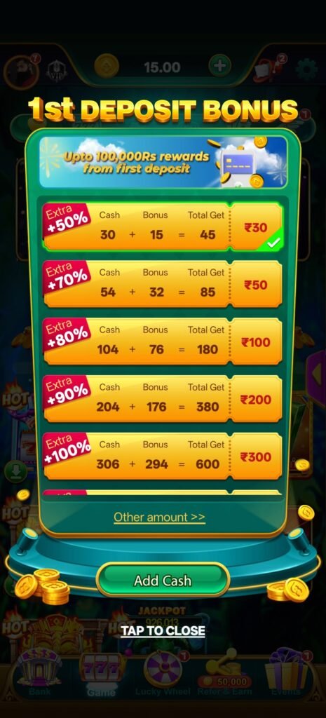 इस app में अलग-अलग deposit amounts पर different bonus percentages मिलते हैं।