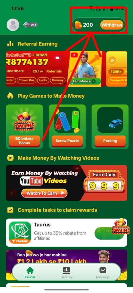 Taurus Game App में users को wallet में Rs. 200 bonus balance मिलता है, जिसे games खेलने और rewards claim करने के लिए use किया जा सकता है।
