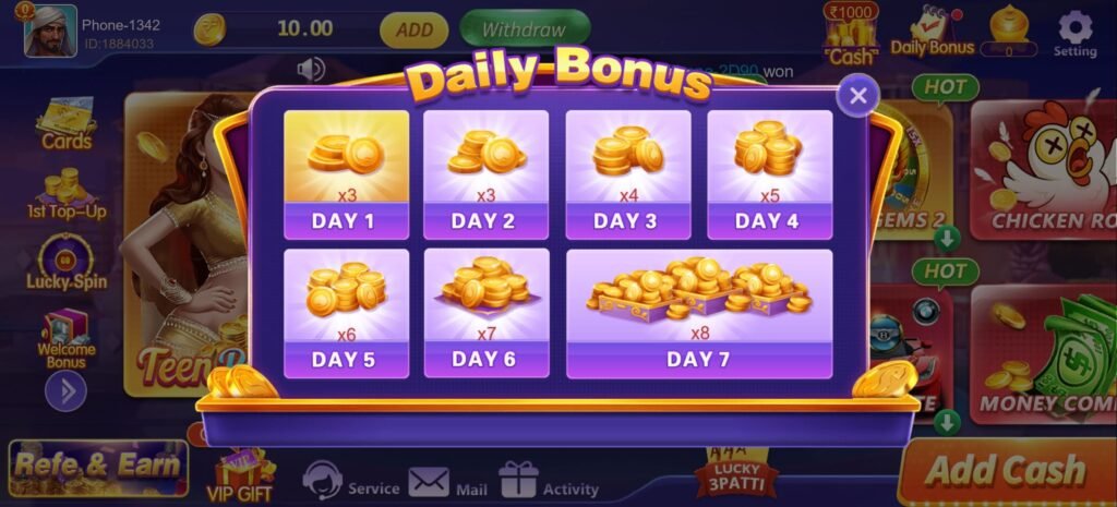 Teen Patti Ace Game daily reward को simple fixed amount की जगह multiplier format में देता है: