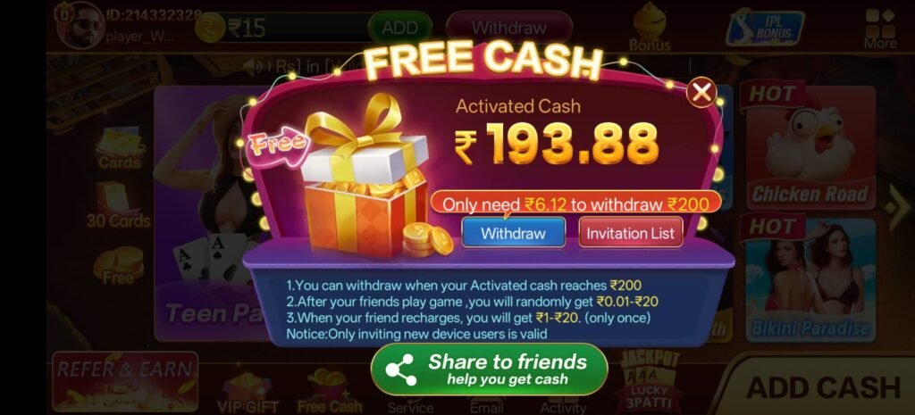 आज का user सिर्फ जीतने के लिए नहीं खेलता—वह चाहता है कि gameplay enjoyable हो, boring न लगे, और हर कुछ मिनट में उसे कुछ न कुछ reward या benefit दिखे। Teen Patti Sweet इसी expectation को perfectly match करता है। Game open करते ही ₹193.88 का free bonus मिलना यह दिखाता है कि platform शुरुआत से ही user को engage करना चाहता है, बिना किसी delay के।