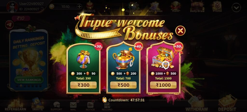 नए users को registration के बाद welcome bonus दिया जाता है। यह bonus अक्सर first deposit या first login offer के रूप में दिया जाता है।