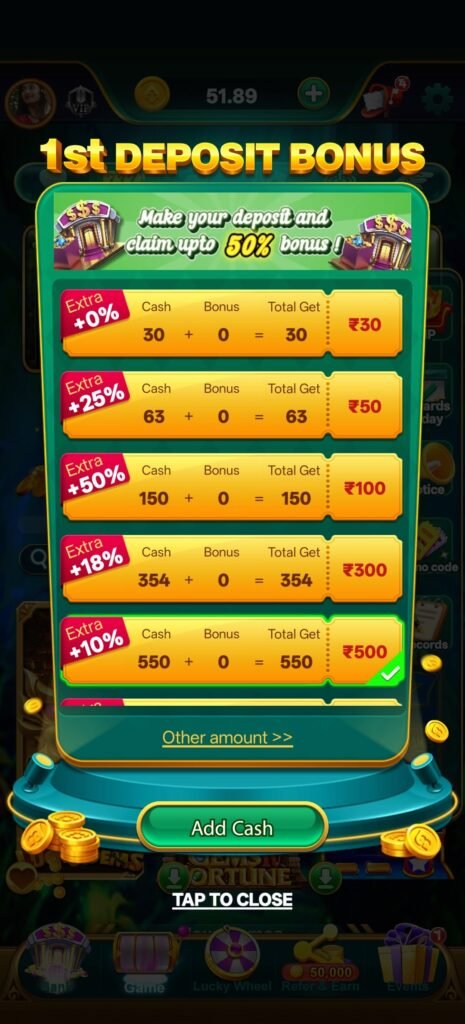 यह structure simple है और user को पहले से clear idea देता है कि किस amount पर कितना bonus मिल सकता है।